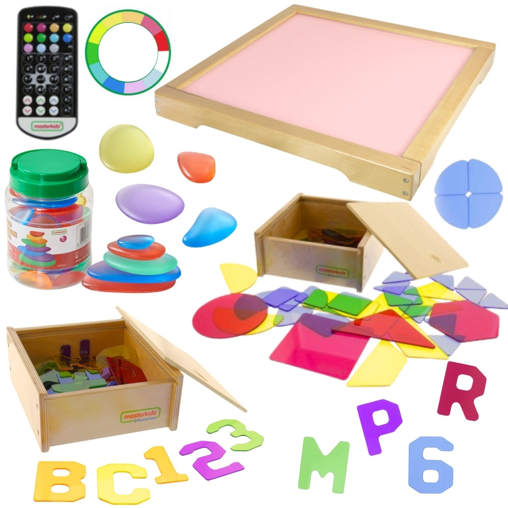 Panel Skrzynia LED Sensoryczna Masterkidz to solidna, drewniana skrzynka z podświetleniem LED emitującym kolorowe światło z możliwością dowolnej konfiguracji dzięki dołączonemu pilotowi, użytkownik może ustawić panel na jeden z 11 zaprogramowanych kolorów, lub ręcznie zmienić emitowany kolor bazując na podstawowych barwach światła: czerwonej, zielonej i niebieskiej. Urządzenie pozwala także na płynne przechodzenie pomiędzy kolorami oraz zapamiętywanie wybranych barw do ponownego użycia. Panel świetlny LED umożliwia różnorodne aktywności wspierające rozwój kreatywności, takie jak mieszanie kolorów czy nauka poprzez system STEM. Efektowne rezultaty uzyskuje się, gdy światło przenika przez różne materiały – liście, papier, tackę z piaskiem czy przezroczystą wodą. Panel doskonale współpracuje z dołączonymi do zestawu kolorowymi akcesoriami które wzbogacają możliwości zabawy i nauki, umożliwiając tworzenie różnorodnych wzorów i kompozycji w świetle.