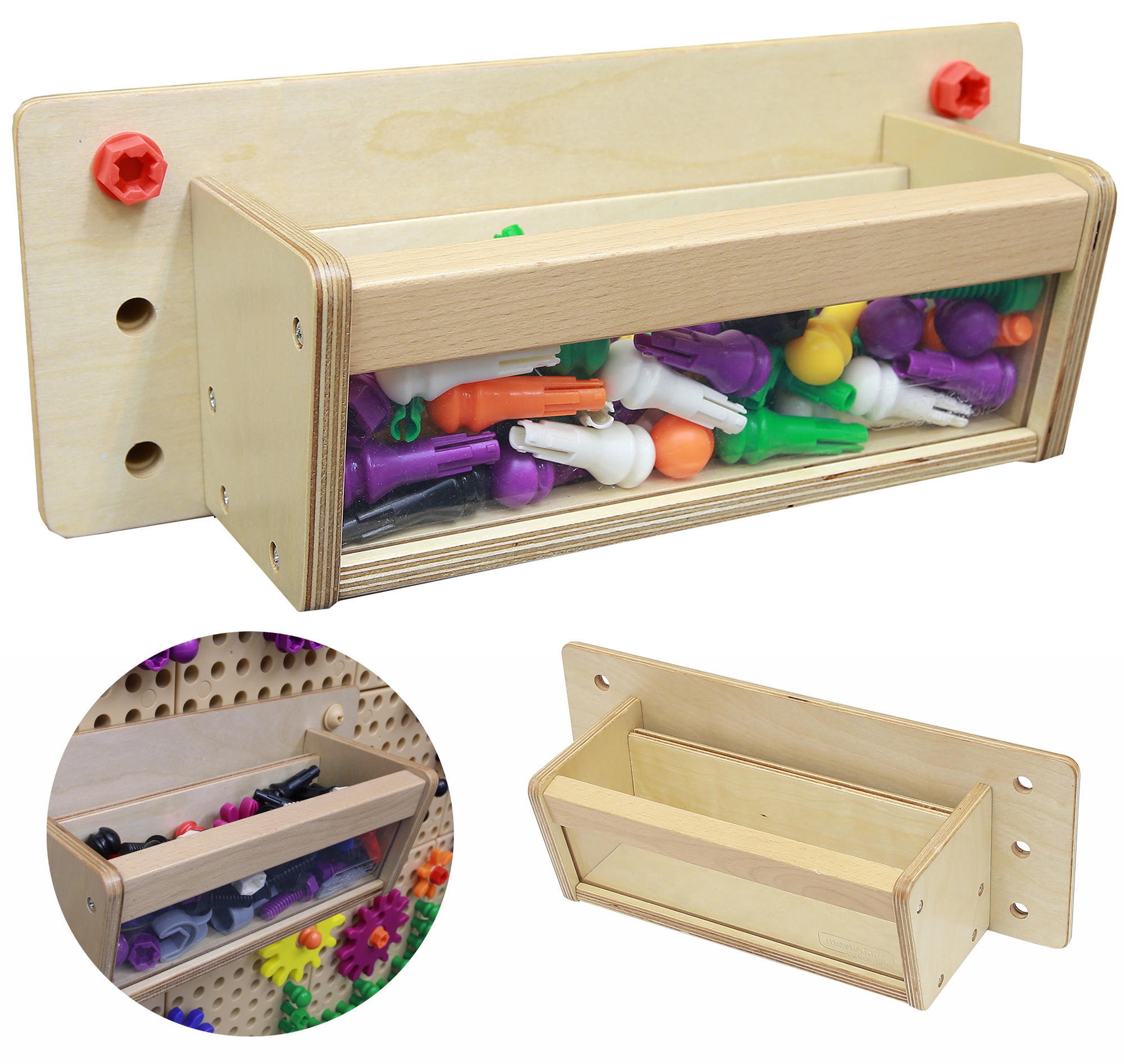 - – Pojemniczek jest montowany za pomocą śrubek Masterkidz bezpośrednio do ścianki STEM, dzięki czemu nawet dziecko poradzi sobie z montażem w dowolnym miejscu na tablicy.