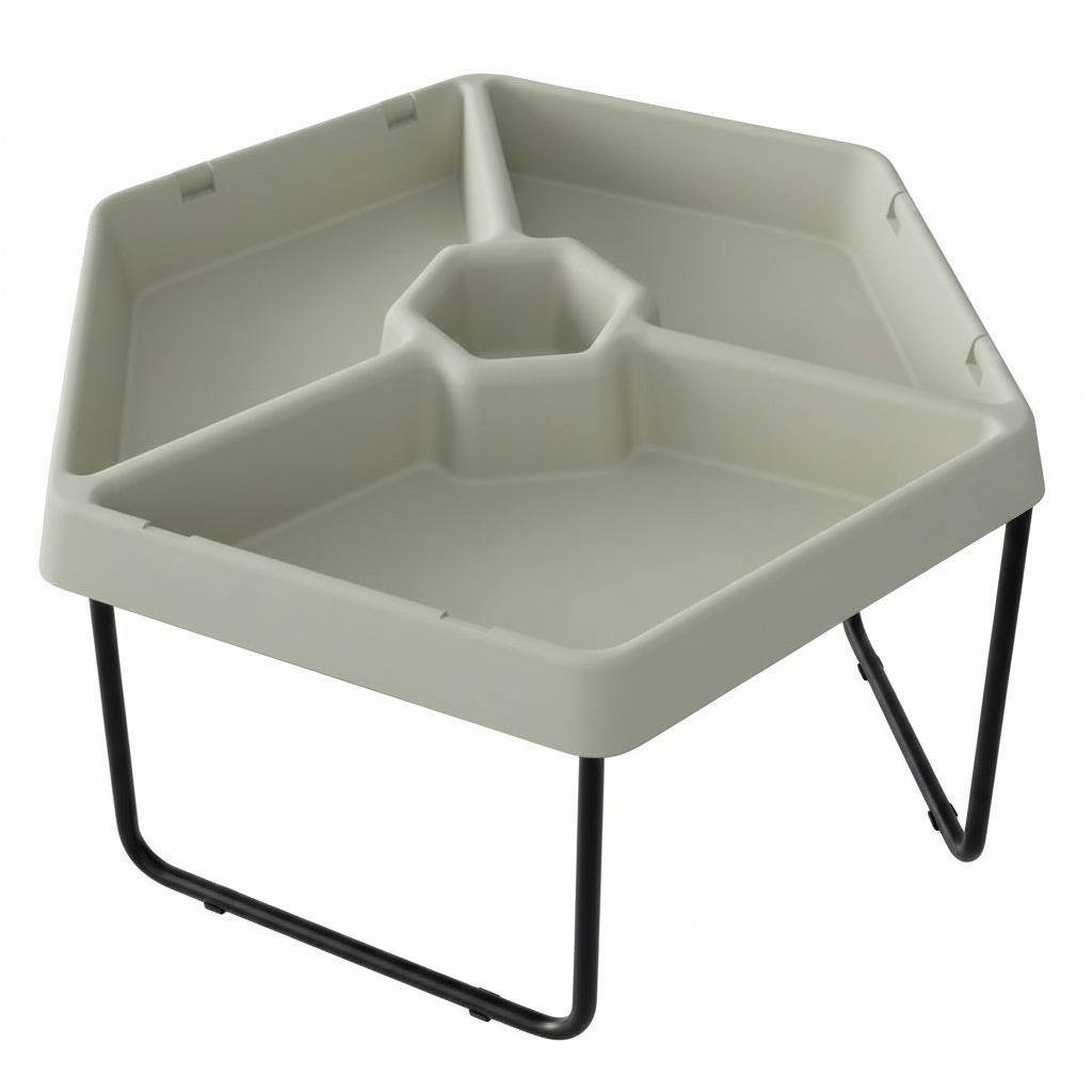 • – Sześciokątna taca podzielona na 3 oddzielne komory – idealna do prowadzenia trzech aktywności w tym samym czasie lub pracy z trzema różnymi substancjami.