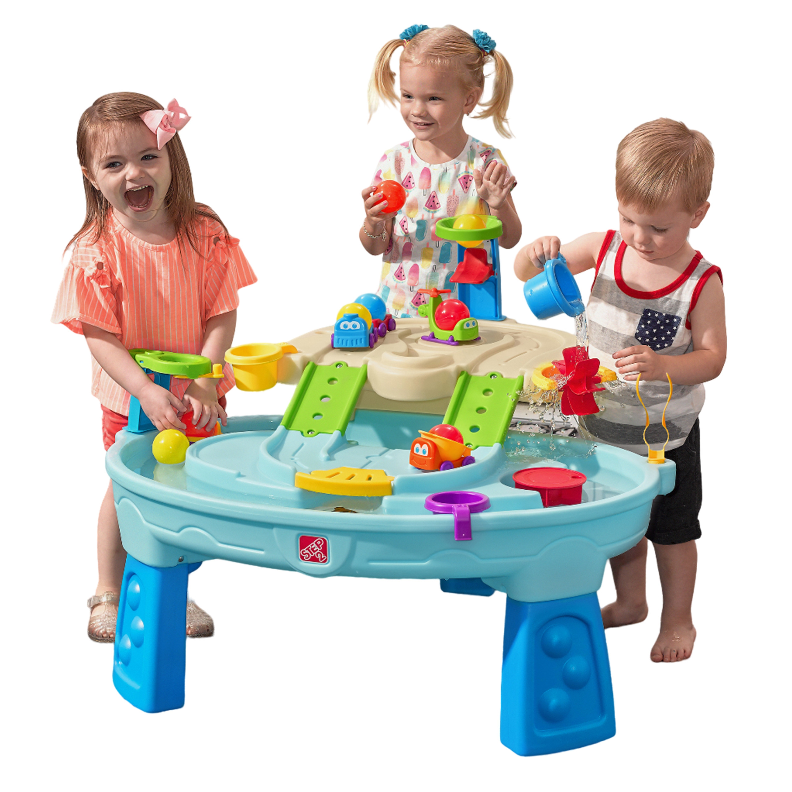 Dwupiętrowy stół dla dzieci Step2 Ball Buddies Adventure Center! Oprócz klasycznej wywrotki Ball Buddies, ten stół do zabawy na zewnątrz dla dzieci zawiera helikopter Ball Buddies, łódź i pociąg – które mogą przewozić dwie piłki do zabawy w tym samym czasie! Ball Buddies nie mogą się doczekać przygody wokół rzeki lub rejsu po zakrętach odlewanych dróg i mostów. Dzięki dużemu obszarowi, wielu dołączonym akcesoriom i wielu sposobom zabawy, ten dziecięcy stół wodny jest doskonałą opcją do zaangażowania się w zabawę społeczną dla wielu dzieci. Ponadto poszczególne stacje wokół basenu oferują dodatkowe opcje dla najmłodszych, którzy chcą bawić się sami. Mali poszukiwacze przygód mogą używać obręczy do rzucania piłek do wody i cieszyć się ekscytującą zabawą wodną za pomocą koła wodnego i dołączonych miarek. Na dnie znajduje się nawet interaktywne koło, dzięki czemu maluchy mogą wprawić wodę w ruch i stworzyć płynącą rzekę.
