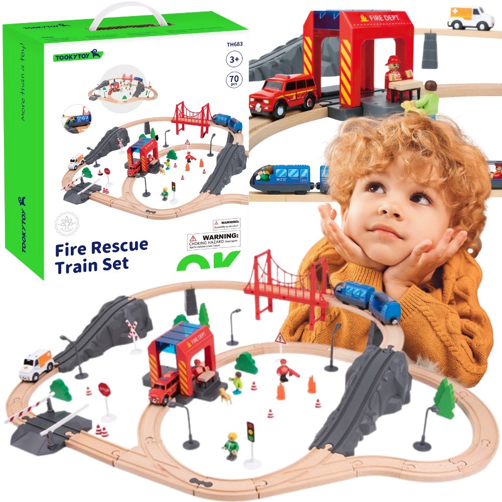 Tooky Toy Drewniana Kolejka Elektryczna Straż Pożarna Efekty Dźwiękowe 70 el. FSC