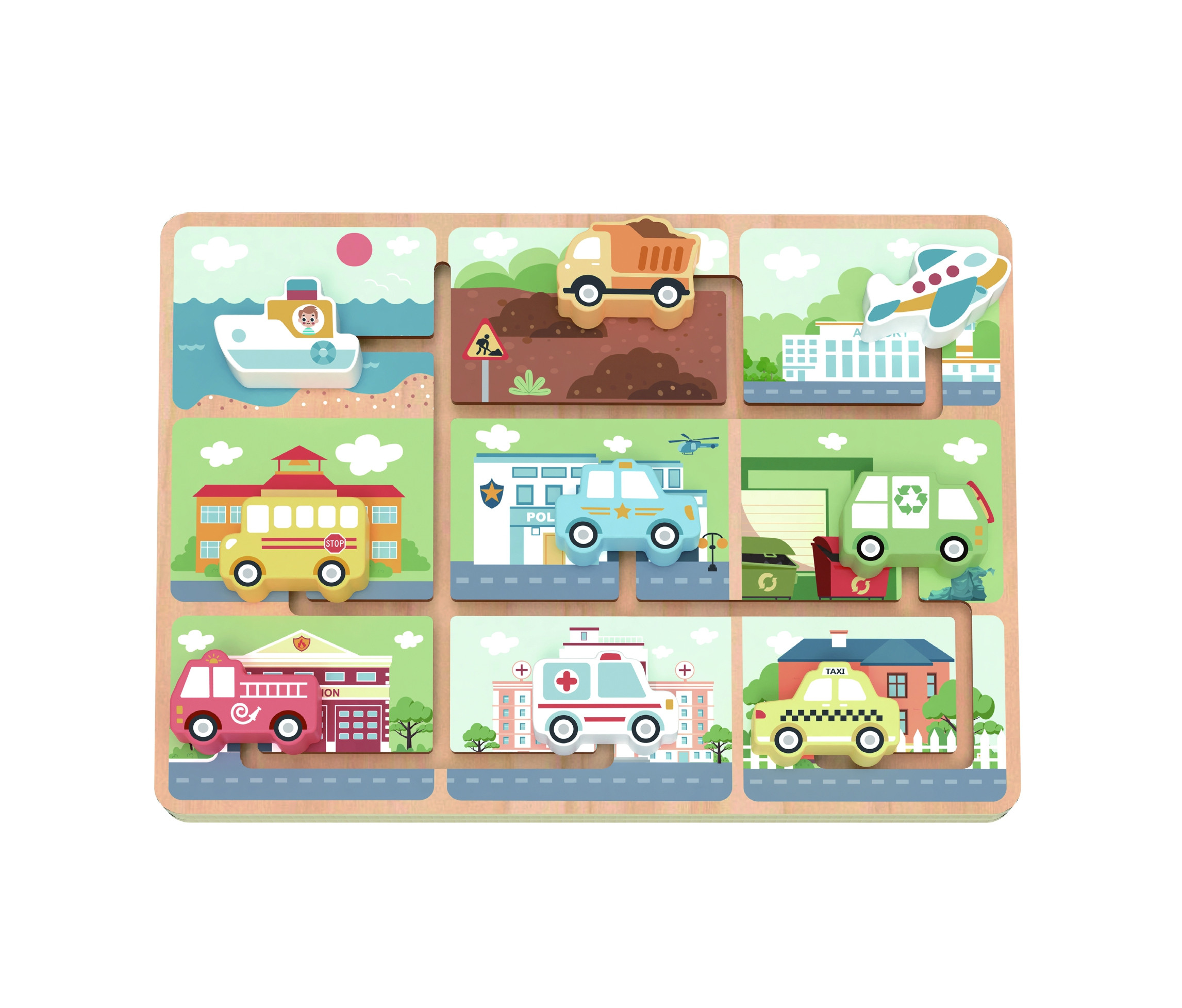 Labirynt Drewniany z Pojazdami od Tooky Toy jest idealną zabawką dla najmłodszych dzieci, rozwijającą ich zdolności poznawcze i motoryczne. Dzieci mogą odkrywać, gdzie typowo parkują pojazdy takie jak policja, karetka, samolot, statek czy autobus szkolny. Zadaniem maluchów jest przesuwanie miniaturowych pojazdów po wyznaczonej trasie, umieszczając je w odpowiednich miejscach. Ta układanka nie tylko zapewnia zabawę, ale także zachęca do logicznego myślenia poprzez planowanie tras ruchu i rozwijanie koordynacji ręka – oko. Ponadto, dzieci uczą się o różnych służbach i ich funkcjach, co poszerza ich wiedzę o o otaczającym świecie.