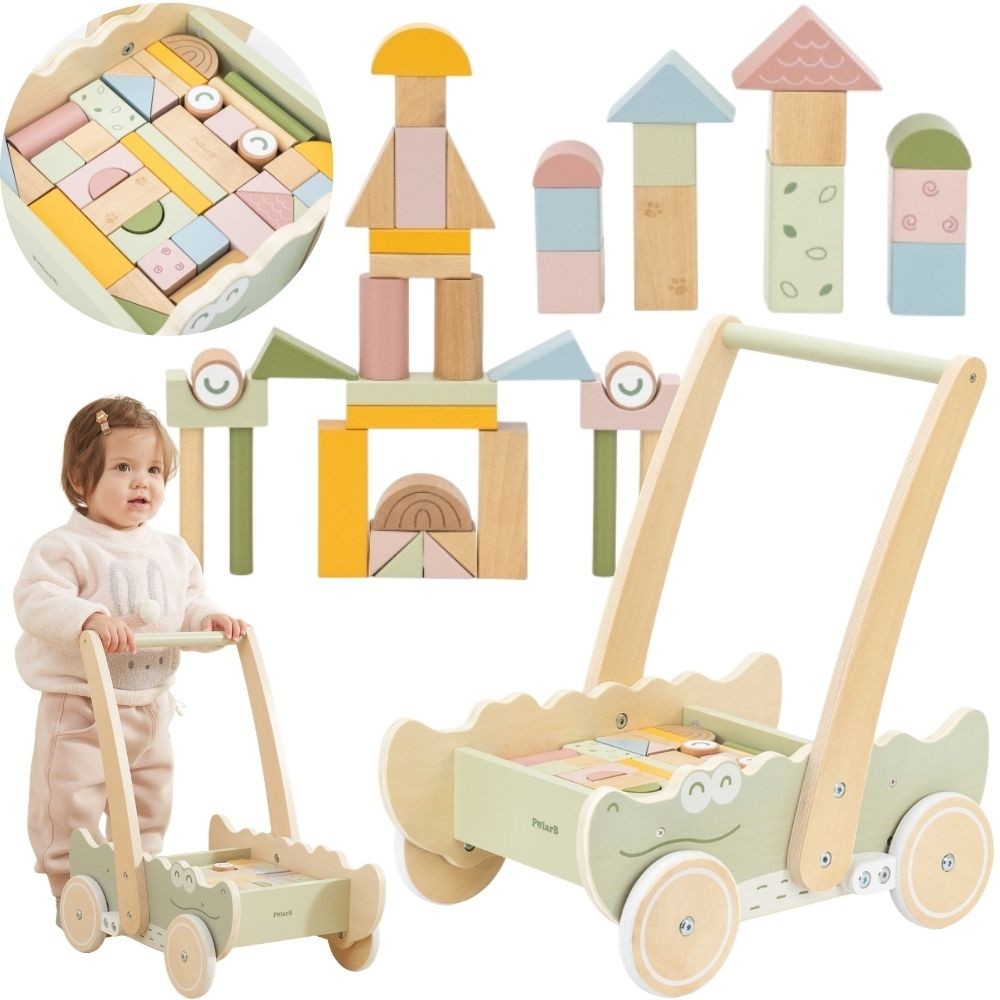 Odkryj radość pierwszych kroków z naszym uroczym chodzikiem-pchaczem w kształcie krokodyla! Ta wielofunkcyjna zabawka to idealny towarzysz rozwoju Twojego malucha. Stabilna konstrukcja i wygodny uchwyt zapewniają bezpieczne wsparcie podczas nauki chodzenia, a zestaw kolorowych klocków znajdujących się wewnątrz chodzika zachęca do kreatywnej zabawy i rozwijania motoryki.