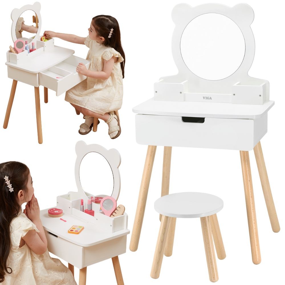 VIGA Duża Toaletka Drewniana Biała z Lustrem i Krzesełkiem