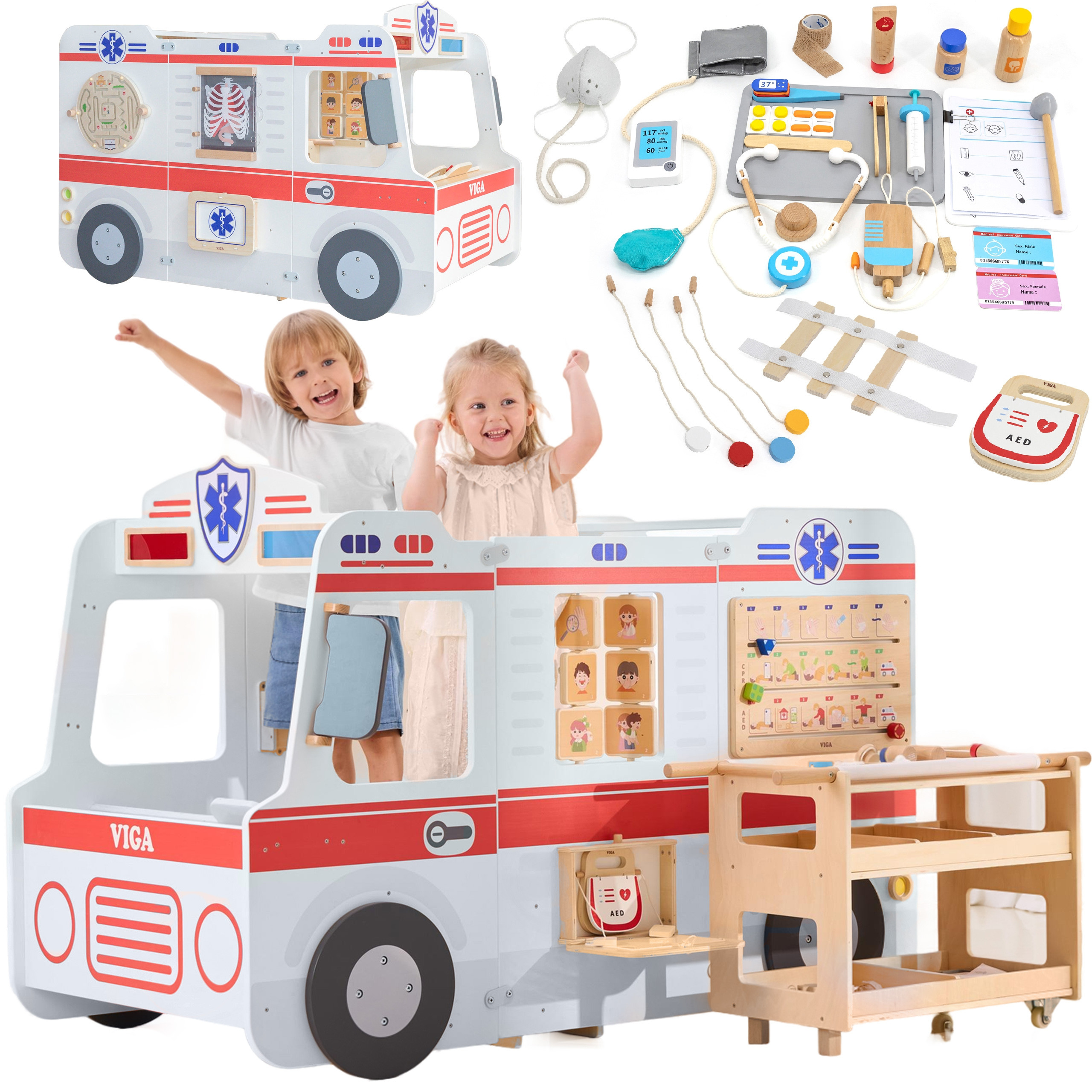 VIGA Duży Drewniany Ambulans Zestaw Karetka Małych Ratowników Akcesoria 25 el.