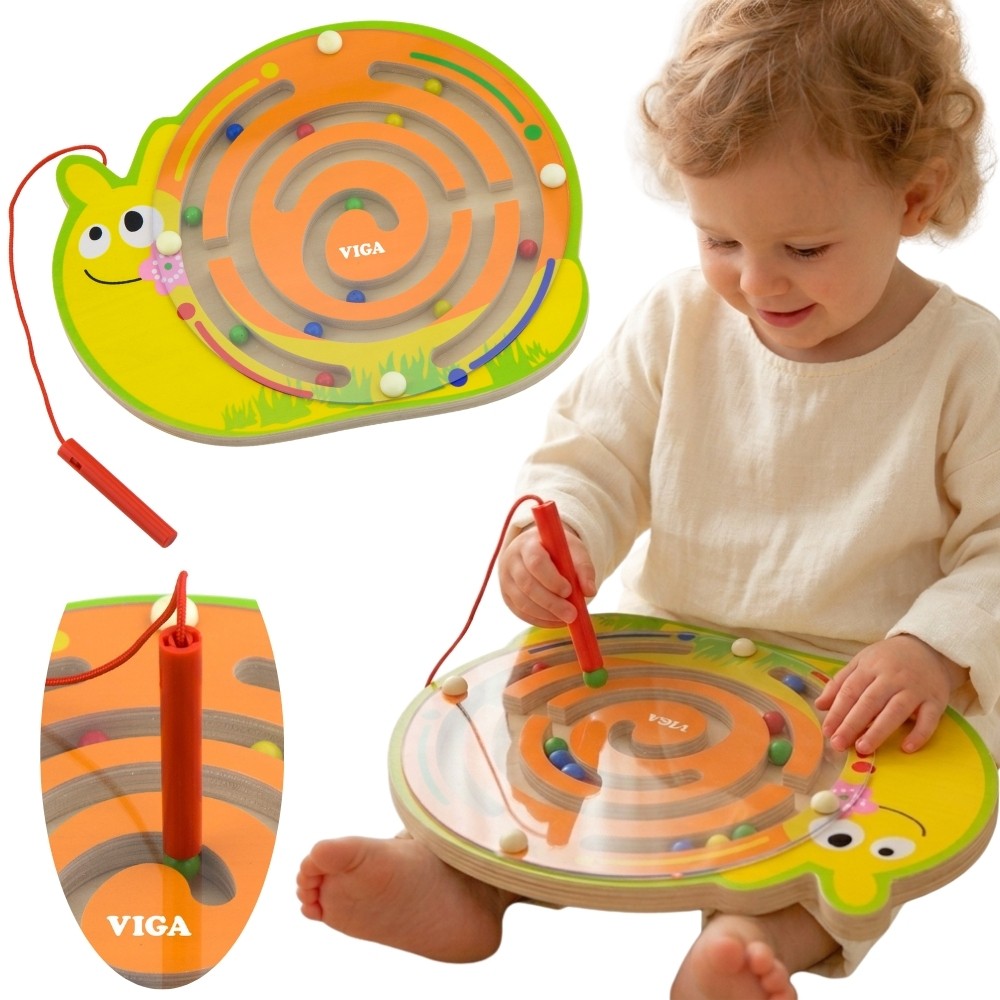 VIGA Labirynt magnetyczny Ślimak to fascynująca i kolorowa gra zręcznościowa, która angażuje maluchy w rozwijającą zabawę pełną skupienia. Drewniana plansza w kształcie sympatycznego ślimaka skrywa wewnątrz kręte ścieżki wypełnione metalowymi kuleczkami. Zadaniem dziecka jest prowadzenie kuleczek przez labirynt za pomocą magnetycznego rysika przymocowanego na sznurku. Całość została zabezpieczona przezroczystą szybką, co gwarantuje bezpieczeństwo i sprawia, że żaden element zabawki się nie zgubi. To idealna propozycja dla małych odkrywców, którzy uwielbiają manipulacyjne wyzwania.