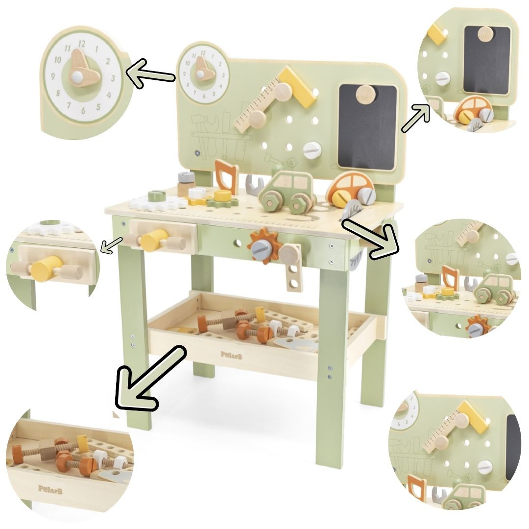 Ten duży, drewniany warsztat majsterkowicza od marki Viga, to idealna zabawka, która zamienia zabawę w praktyczne, kreatywne zajęcie pełne nauki i zabawy! Dzięki niemu Twoje dziecko poczuje się jak prawdziwy mechanik – wbija gwoździe, dokręca śruby i przykręca elementy, ćwicząc ręce i umysł. Warsztat ma także zegar ze wskazówkami, drewniane samochodziki oraz wygodne miejsca do przechowywania narzędzi, co czyni zabawę jeszcze ciekawszą. Solidne wykonanie z drewna i bezpieczne, nietoksyczne farby dają rodzicom spokój, a maluchom radość z eksplorowania i tworzenia. To zabawka, która nie tylko bawi, ale też wspiera rozwój małych rączek, wyobraźni i koordynacji w codziennej zabawie!