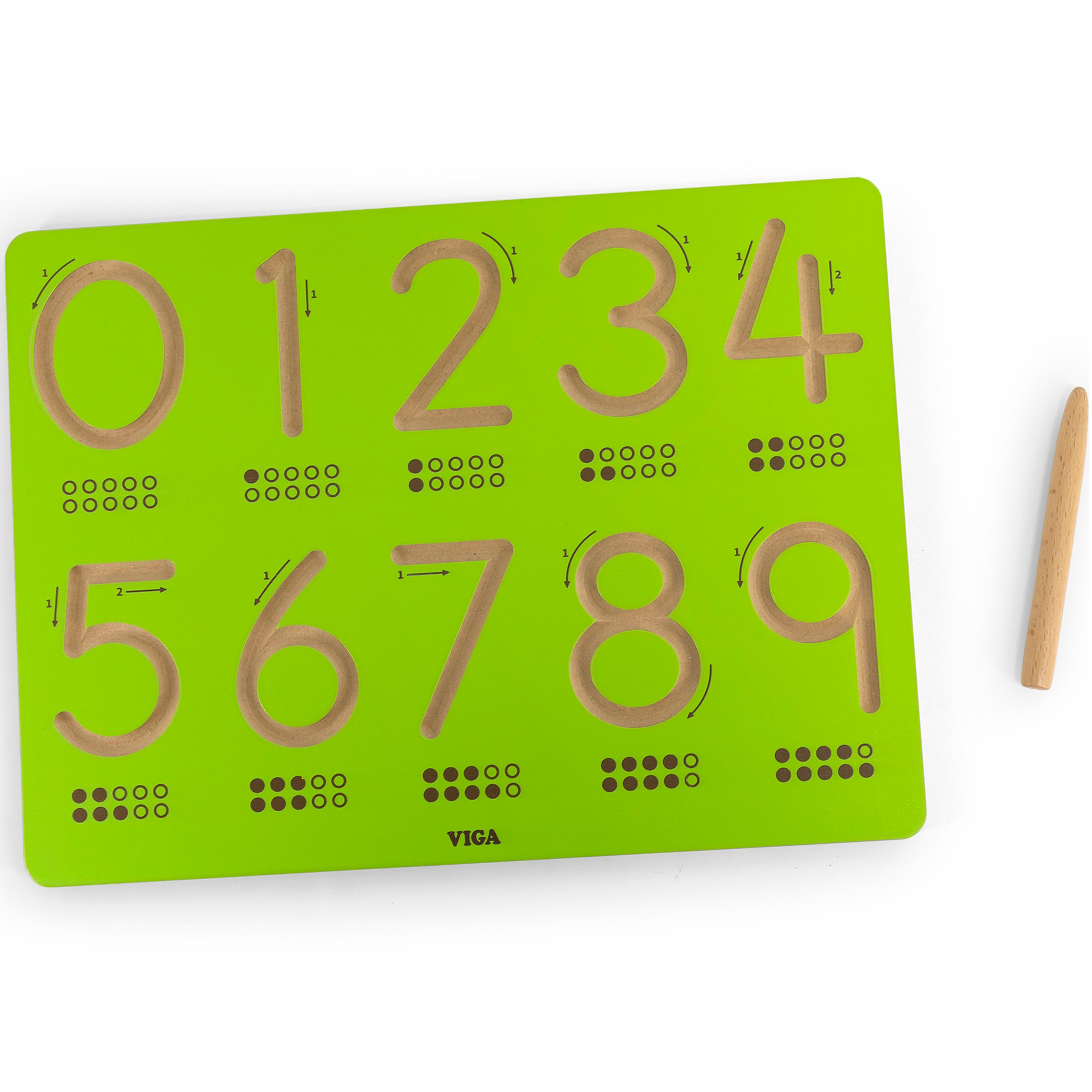 Tablica kreślarska od marki VIGA to idealna propozycja dla dzieci do trenowania rączki przed nauką pisania. Delikatnie wygrawerowane  i zakrzywione rowki sprawiają, że idealnie nadaje się dla dzieci do kontrolowania ruchu dłoni i kształtowania pamięci mięśniowej poprzez wielokrotne śledzenie. Każda cyfra jest oznaczona strzałkami, co pomaga dzieciom w prawidłowej kolejności pisania. Tablica jest dostępna w kompaktowych rozmiarach, dzięki czemu dzieci mogą ją trzymać i używać na stole lub biurku.Dziecko poprzez zabawę uczy się ruchów odpowiedzialnych w przyszłości za rysowanie i pisanie, kształci płynność ruchów oraz ćwiczy koordynację wzrokowo – ruchową.