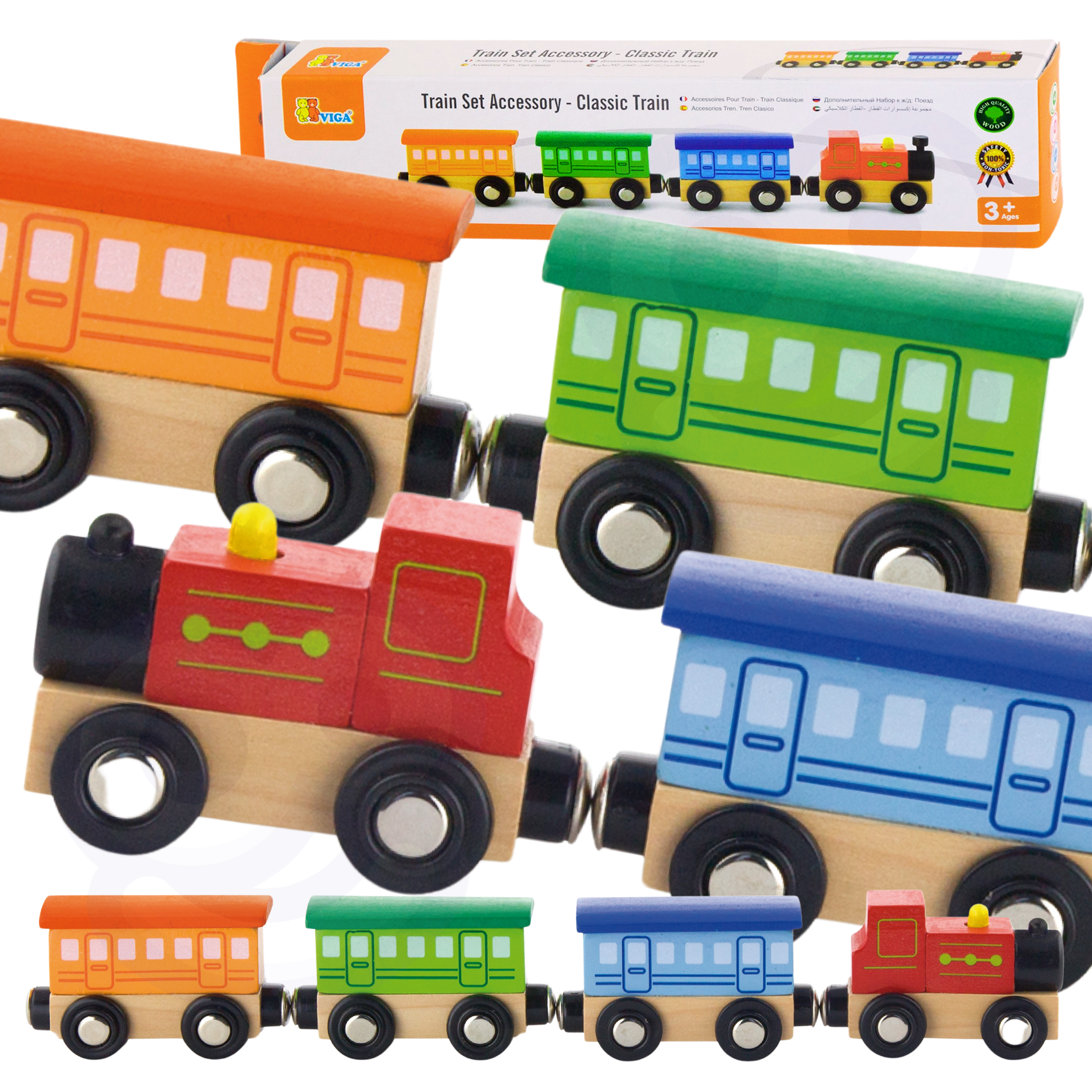 Zestaw akcesoriów do kolejki to klasyczny pociąg, który zagwarantuje dziecku mnóstwo doskonałej zabawy. Składa się z 4 elementów połączonych magnesami. Komplet może być wykorzystywany jako samodzielna zabawka, ale sprawdzi się również idealnie jako uzupełnienie kolejki, innych zestawów czy klocków drewnianych.