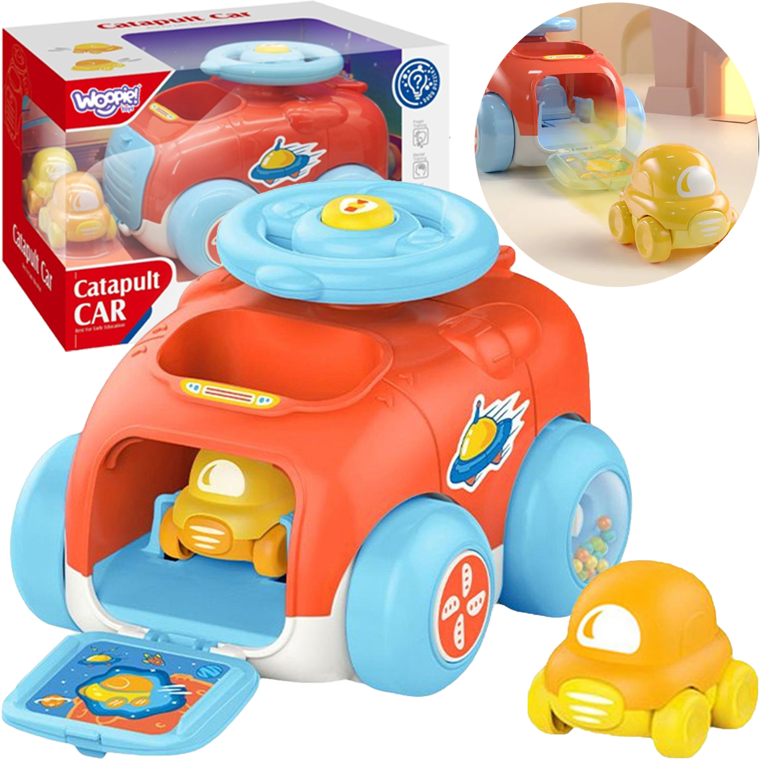 Samochód z wyrzutnią w marki WOOPIE to świetny pomysł dla dzieci. W środku auta mamy 2 mniejsze pojazdy na kółkach. Do całości zestawu dołączona jest wyrzutnia która pozwala jeszcze bardziej urozmaicić zabawę. Umieść autko w katapulcie, zakręć kierownicą i naciśnij klakson, a Twoje autko wyskoczy z pojazdu! Samochód posiada też elementy sensoryczne takie jak dźwięki w kołach, gdy się obracają. Świetna opcja zabawy z przyjaciółmi bądź samemu.