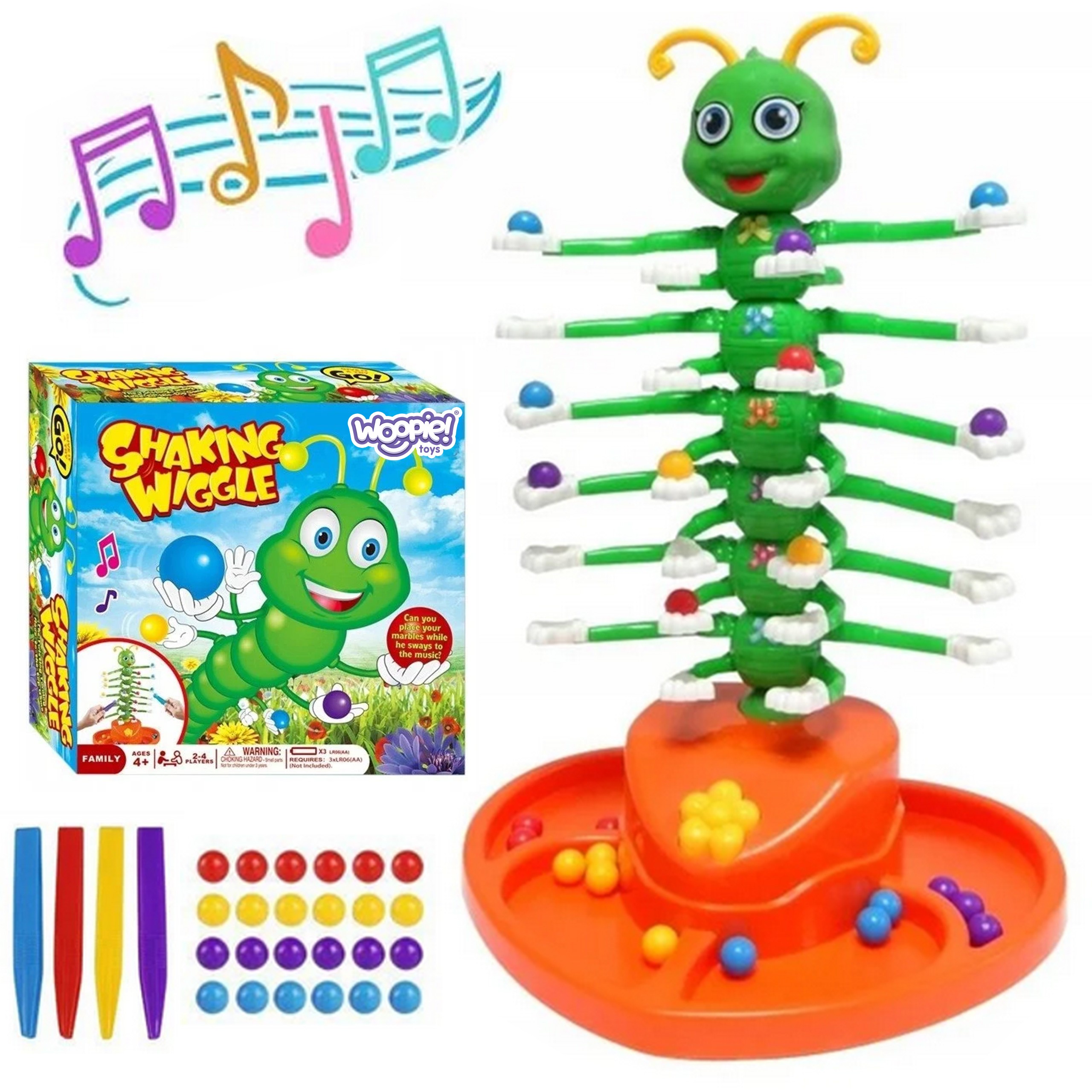 - – Gąsienica porusza się (kołysze) i gra wesołą melodię, co utrudnia ułożenie kulek.