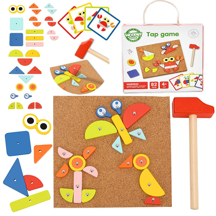 - – zestaw zawiera 82 el.: 30 klocków, 40 pinezki, 10 kart z 20 wzorami, tablice korkową oraz młotek