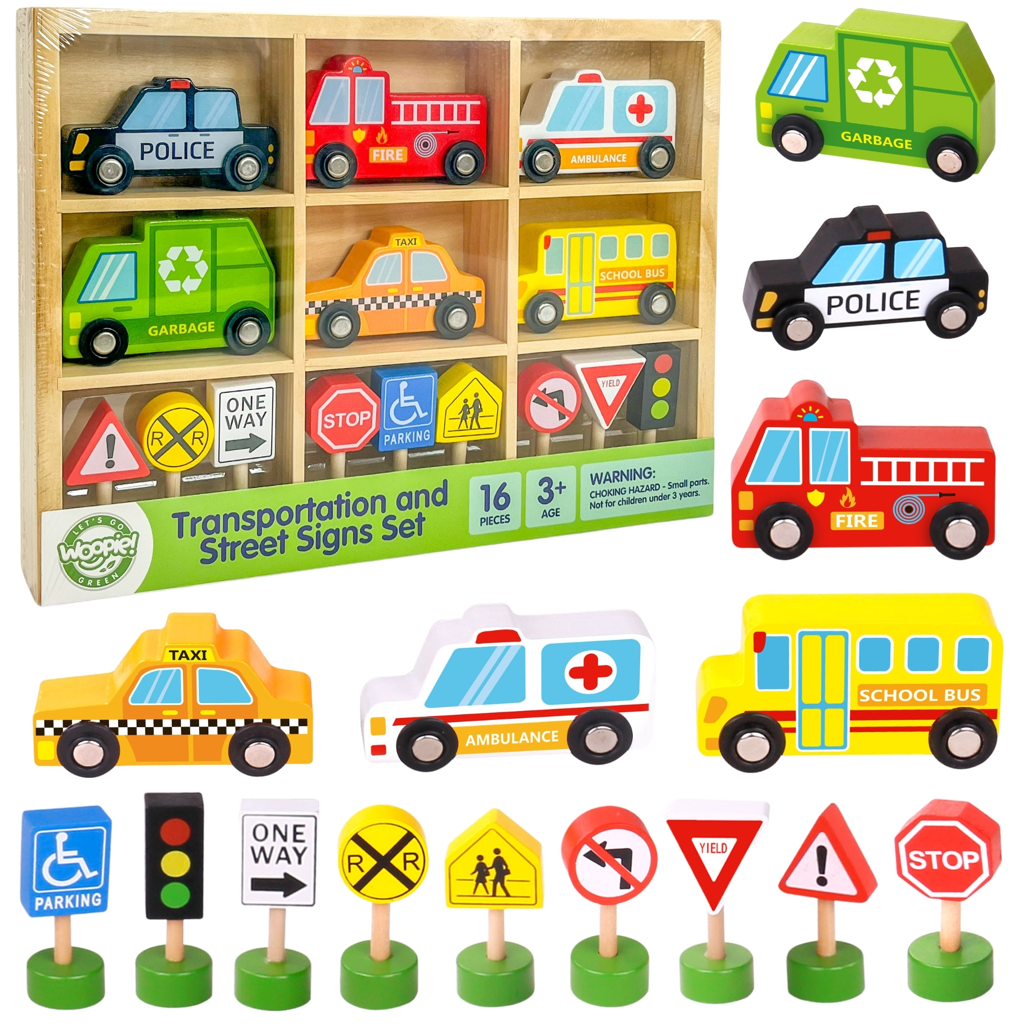 Zestaw drewnianych pojazdów i znaków drogowych od marki WOOPIE GREEN! Odkryj świat transportu z kolorowym zestawem aż 16 elementów – idealnym dla małych miłośników motoryzacji! W komplecie znajdziesz realistyczne pojazdy, takie jak policja, straż pożarna, ambulans, śmieciarka, taxi i szkolny autobus, oraz zestaw znaków drogowych uczących zasad bezpieczeństwa. Wykonane z solidnego drewna elementy są bezpieczne, trwałe i idealne dla dzieci 3+. To nie tylko zabawa, ale też nauka poprzez odgrywanie ról i poznawanie zasad ruchu drogowego!