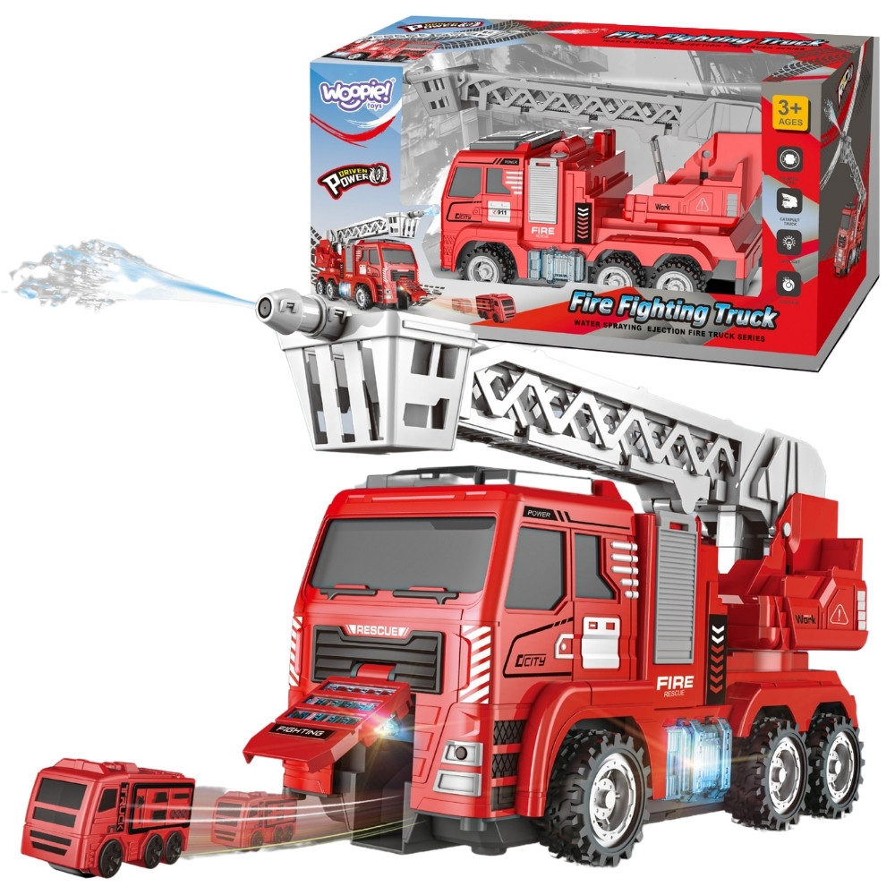 Samojeżdżący wóz strażacki to doskonała zabawka, która pozwoli każdemu małemu miłośnikowi pojazdów ratunkowych poczuć się jak prawdziwy bohater. Zabawka została zaprojektowana z dbałością o najmniejsze detale, które wiernie odwzorowują prawdziwy pojazd strażacki. Model wyposażony jest w wysuwającą się drabinę, oraz armatkę wodną. Po włączeniu pojazd zaczyna jeździć po podłodze wymachując drabiną z armatką wodną na boki, okazjonalnie wystrzeliwując z przodu pojazdu mini pojazdy straży pożarnej