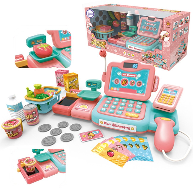 Kasa Sklepowa z wieloma dodatkami od Woopie to idealny pomysł dla dzieci powyżej 3 roku życia. Zabawka rozwija wyobraźnię dzieci i zachęca je do kreatywnego myślenia. Dzieci mogą ważyć owoce i warzywa, a następnie nabić je za pomocą klawiatury na kasę. Przy pomocy czytnika dzieci zeskanują paczkę ciasteczek lub butelkę wody. Następnie będą mogły zapłacić na dwa sposoby: tradycyjnie za pomocą pieniędzy lub za pomocą karty płatniczej. Wszystko to jest dołączone do zestawu i zapewni dziecku długie godziny zabawy.