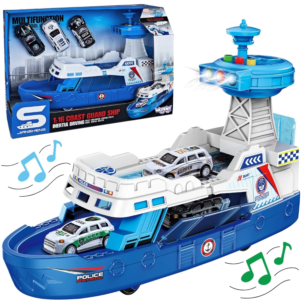 WOOPIE Łódź Policyjna Patrolowa Interaktywna – Skala 1:16 + Autka 3 szt.