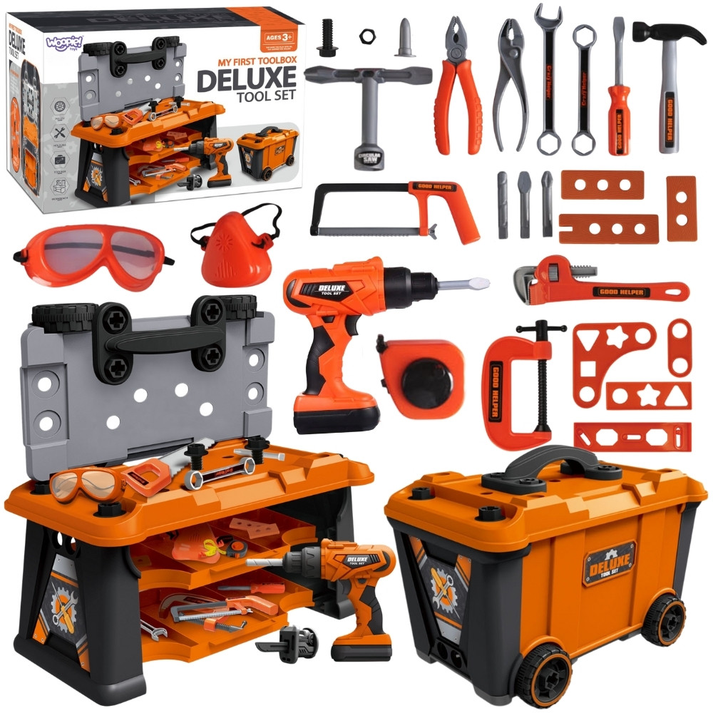 Mobilna Skrzynia Na Narzędzia Warsztat 2w1 Wykonana z solidnych tworzyw sztucznych z pomarańczowo-czarno-szarymi elementami, w łatwy i bezpieczny sposób pozwala dzieciom wcielić się w rolę prawdziwego fachowca. Ten funkcjonalny zestaw 2w1 to nie tylko warsztat, ale również walizka na kółkach, która stanie się ulubionym kompanem zabaw. Ten praktyczny zestaw wspiera kreatywną zabawę w odgrywanie ról i pozwala dzieciom na rozwijanie umiejętności manualnych poprzez zabawę.