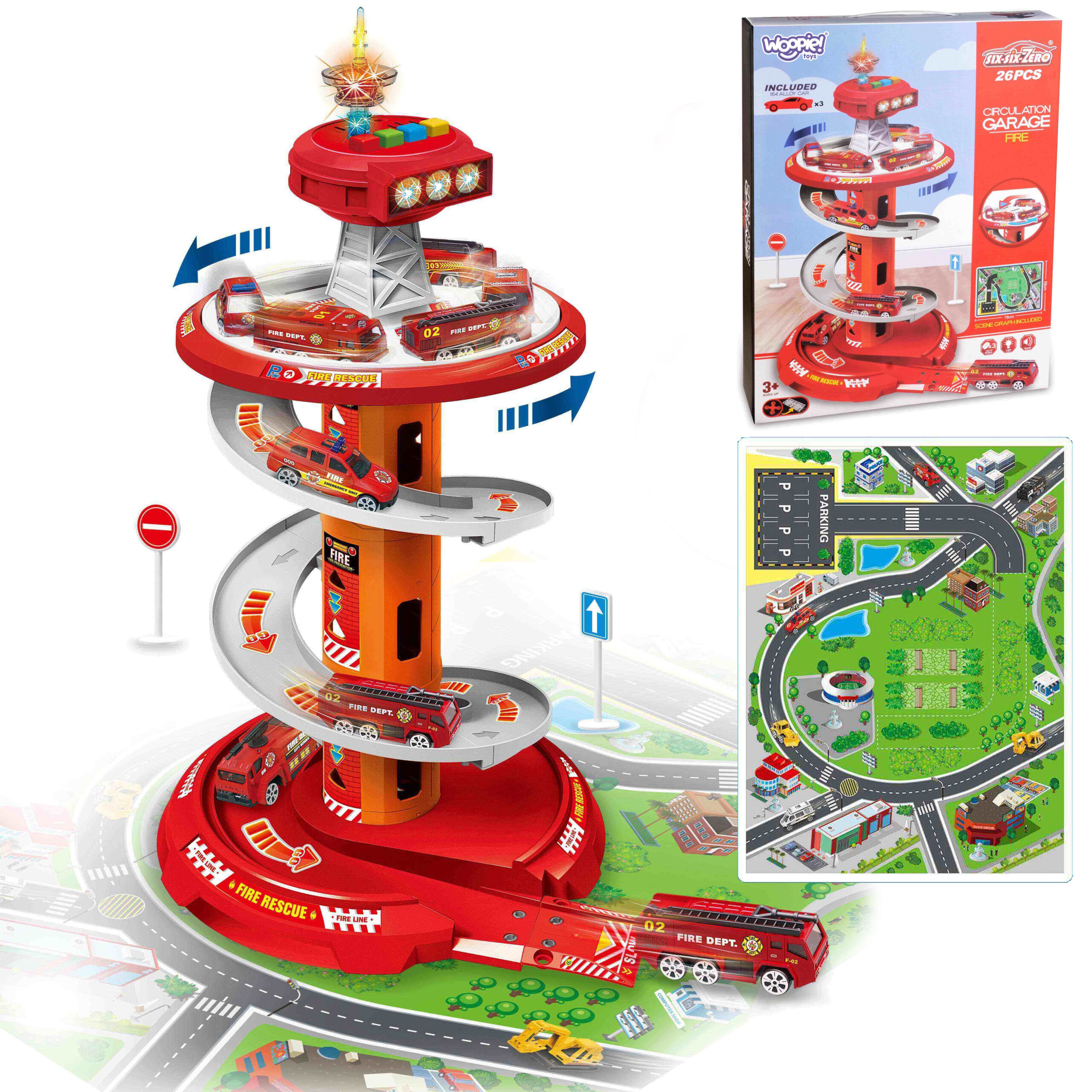 Rewelacyjny wielopoziomowy parking garaż obrotowy dla Straży Pożarnej od firmy Woopie na pewno przypadnie dziecku do gustu. Zabawka ta rozbudzi wyobraźnię każdego fana służb mundurowych która po wyjeździe z parkingu wkracza na załączoną do zestawu drogę. Szybki zjazd samochodów z poszczególnych poziomów umożliwia specjalny, kręty zjazd. Ponadto w zestawie znajdują się 3 różne samochody straży pożarnej.