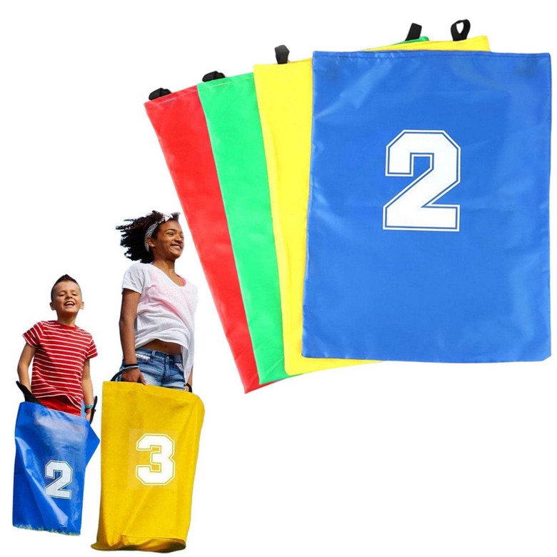 - – 4 trwałe worki do skakania w żywych kolorach (czerwony, zielony, żółty, niebieski)