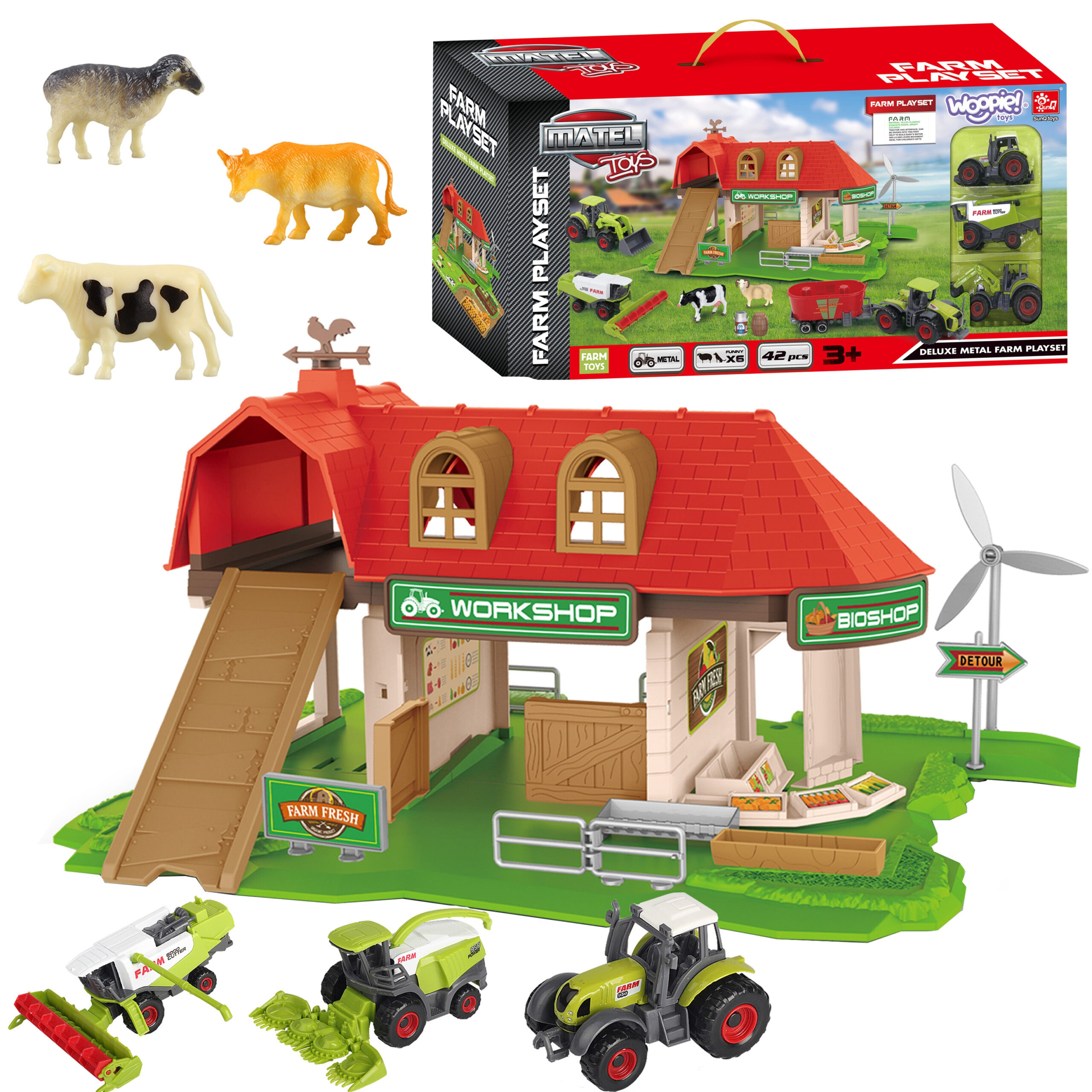 Zestaw Farma Sklepik z Traktorami od marki WOOPIE to idealna zabawka dla miłośnika wiejskiego życia. W zestawie oprócz super farmy znajdują się 3 figurki zwierząt, 3 różnego rodzaju traktory/kombajny – łącznie aż 42 elementy. Farma jest dość nowoczesna, ma 2 poziomy i również znajduje się na niej m.in sklepik z bio żywnością, co dodatkowo rozwinie świadomość ekologii u dziecka. Figurki zostały bardzo dokładnie odwzorowane i są bardzo wytrzymałe. Dzięki zabawie w farmę maluch poszerzy zakres swojej wyobraźni i kreatywności.